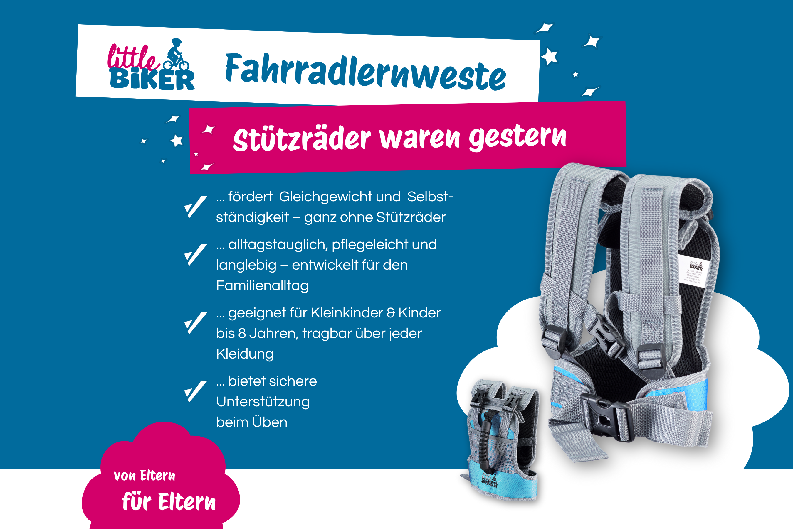 Heute lernt man Fahrradfahren mit little Biker – der praktischen Fahrradlernweste! -